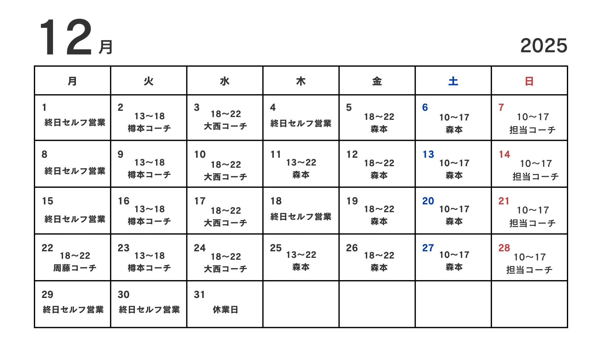 12月のコーチのシフトが完成しました!